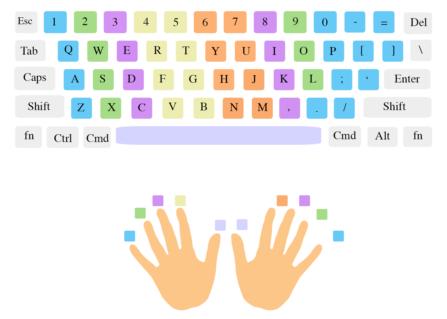 Left or right Thumb can be used for the space bar depending on ones comfortability. Every time after typing each letter the fingers should rest on the base row for easy identity of keys.
